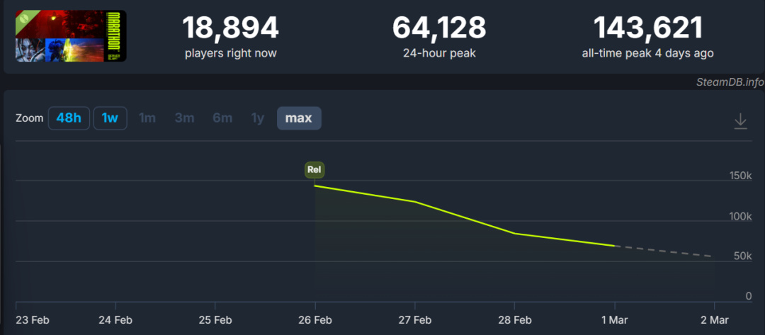 测试进行到第三天时,《马拉松》在线玩家人数跌至7.6万,相比首日下滑近47%。按理来说,周末应该是玩家上线的高峰时段,《马拉松》却呈现出下滑的曲线。现在的热度还是建立在“免费体验”的基础上,尽管海外玩家对买断制游戏接受程度良好,40美元(国区168元)的售价在没有足够的口碑支撑时,还是可能导致部分玩家持观望态度,付费意愿弱。