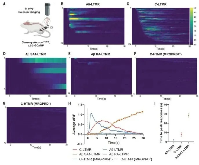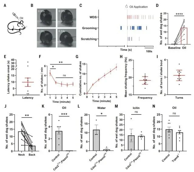 首先,团队在小鼠的背部和颈部涂抹油和水等不同刺激物,观察多种机械感受神经元的反应。接着,他们通过基因改造去除了一部分小鼠的C-LTMRs。去除这些感受器后,小鼠的甩水行为显著减少,表明这些感受器在触发甩水反应中起着关键作用。