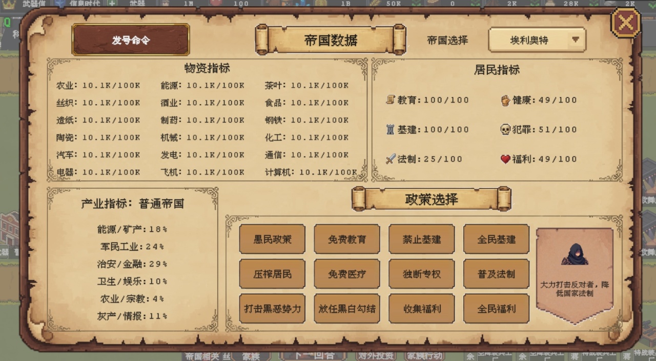 帝国境内的每一项产业布局,都会直接牵动民生的方方面面 —— 教育水平、健康医疗、基建建设、犯罪率、法治秩序、社会福利,桩桩件件,都尽在您的布局掌控之中。倘若您选择行王道正途,将民生福祉推向顶峰,子民便会安居乐业,幸福指数节节攀升,人口生育率亦会随之上涨,而充沛的人口,正是我们家族产业版图不断扩张的核心根基。反之,倘若民生凋敝,子民困苦不堪,不仅生育率会断崖式下跌,更会出现大规模的移民外流,届时我们的产业将无人可用,手中的权柄也会摇摇欲坠。这一点,我必须郑重地向您禀明。