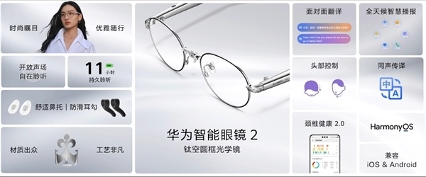 作爲參考,華爲曾於2023年推出華爲智能眼鏡2,其鏡腿內置發聲單元,實現眼鏡與無線耳機二合一設計,並可深度接入華爲智慧生態,支持手機、平板、PC等多設備暢連,同時可與兩臺設備保持連接,實現音頻在不同設備間的無縫流轉。