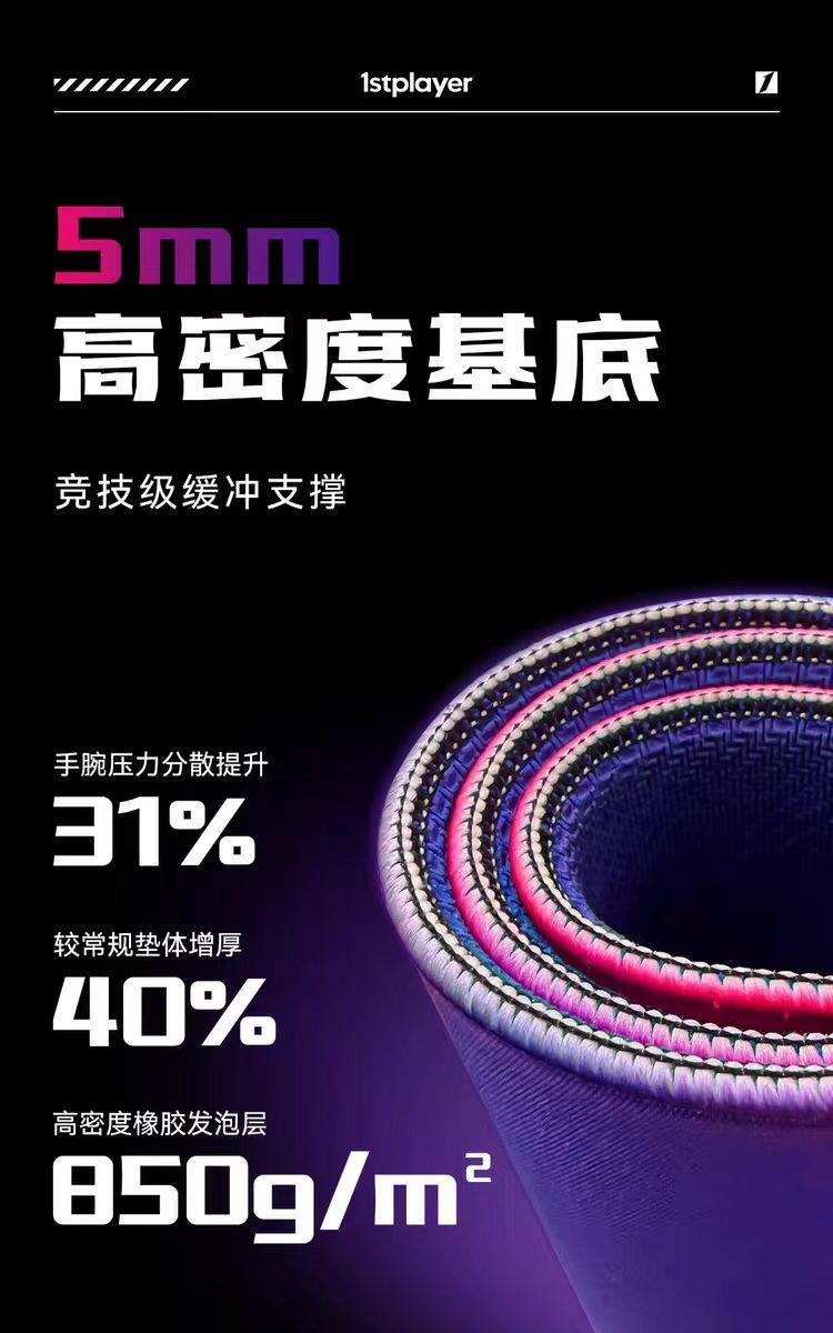 鼠标垫的厚度为5mm,厚鼠标垫最大的优势就是对手腕起到一个很好的缓冲作用,并且内部填充为高密度橡胶发泡层,妥妥的电竞级缓冲支撑。