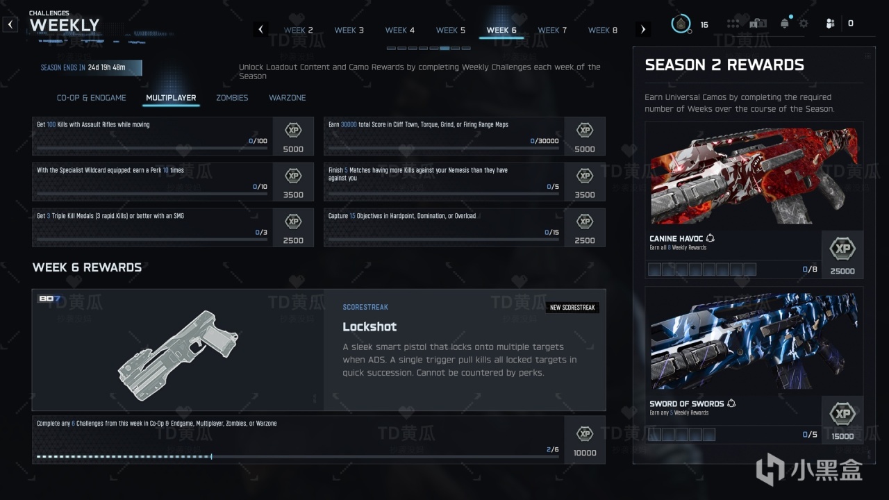 继续完成每周挑战,解锁MXR-17 ANVL改装套件、智慧锁定手枪积分奖励和Maddox RFB蓝图,完成指定周数后还有“剑中之剑”动态迷彩和“犬类浩劫”动态迷彩。