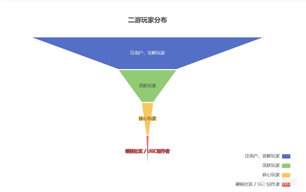 总结:由于二游的玩法趋同,以及商业模式(抽卡)的固化反作用与游戏内容形态(厂家卷精美演出),导致玩家结构失衡。游戏社区缺少UGC内容创作,难以吸引新玩家