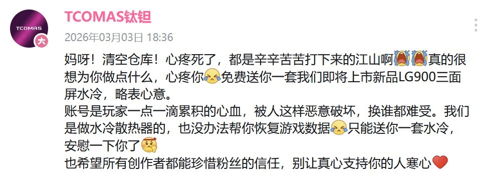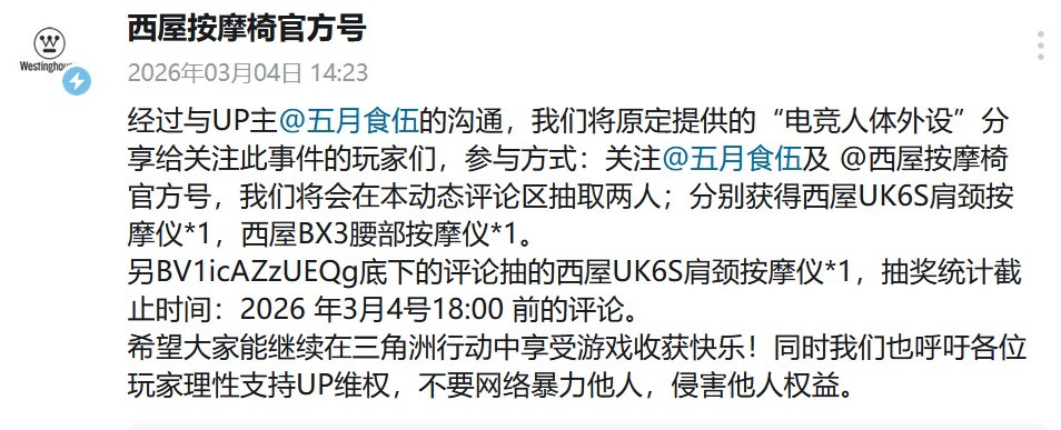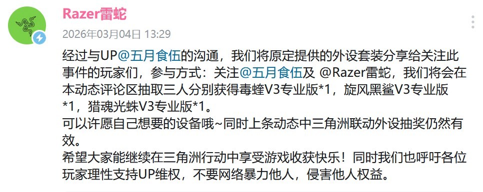 号主和品牌方沟通后,决定将原本赠送给号主的产品用于抽奖,分享给关注此事件的玩家们。