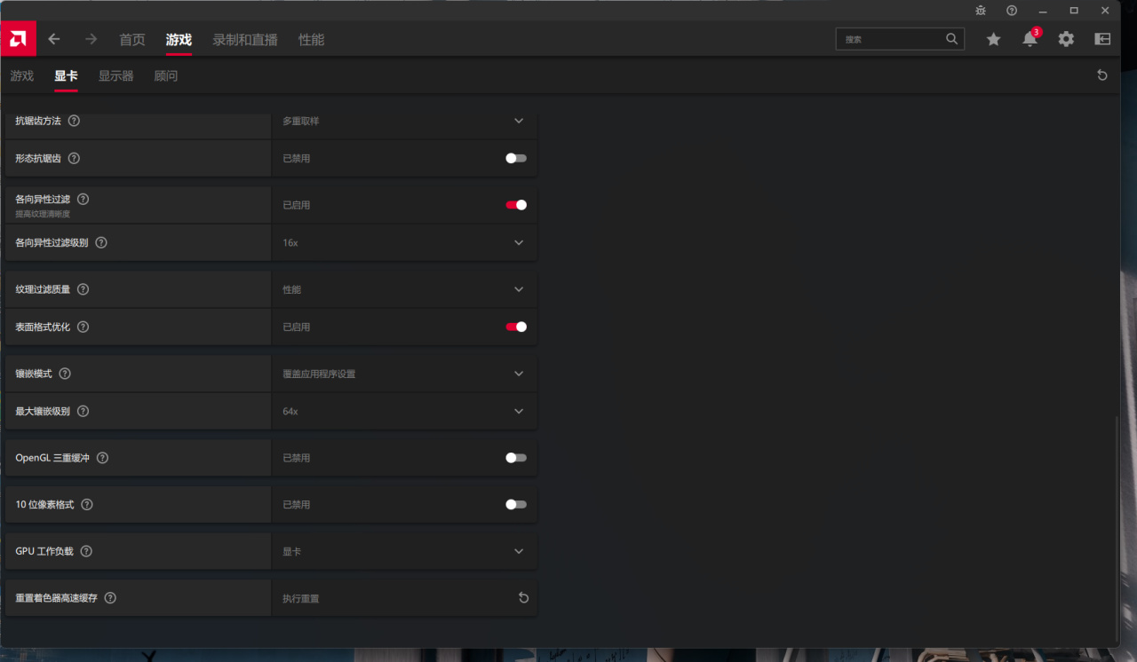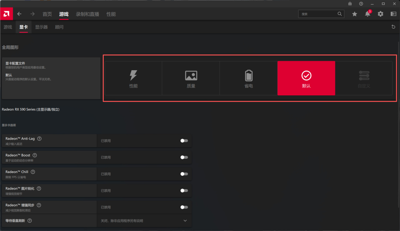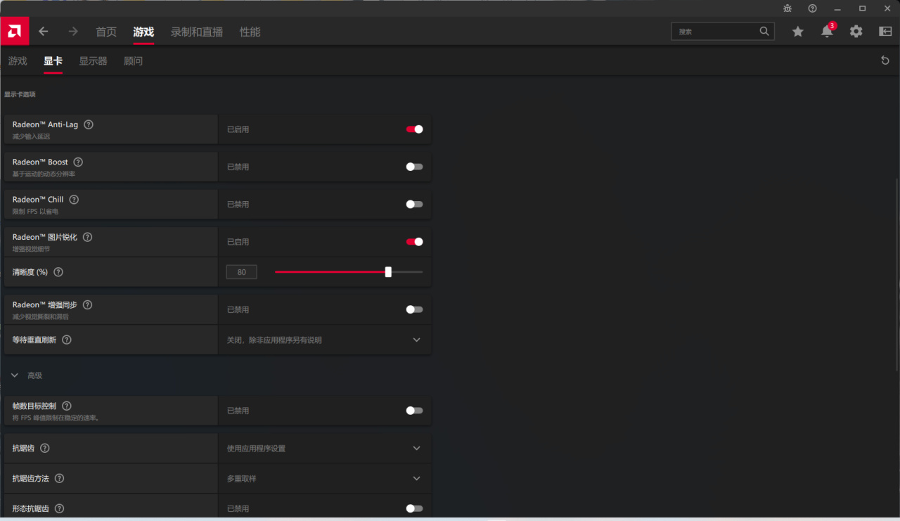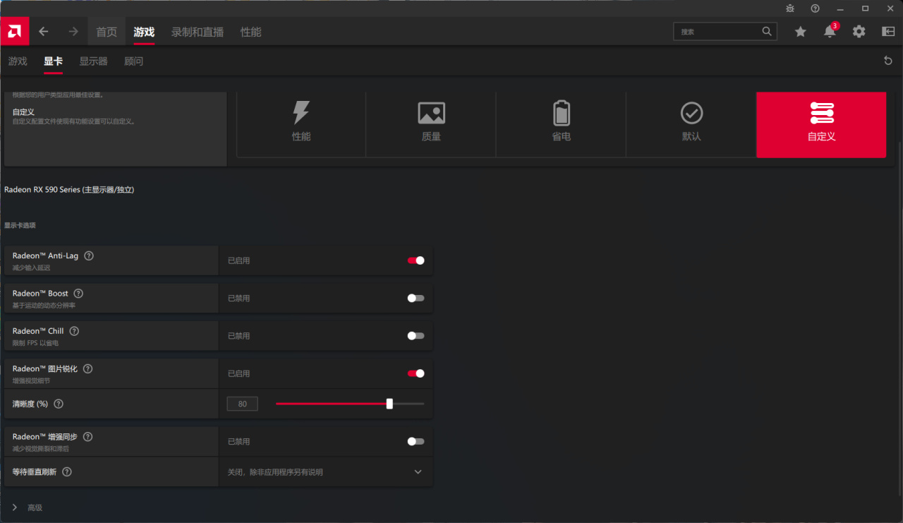 Radeon Anti-lag 【启用】:减少输入延迟(实际无明显感受)。