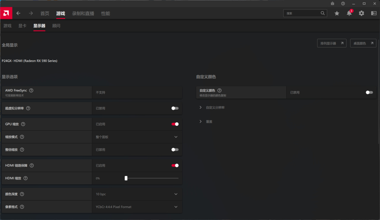 10位像素格式【禁用】:显示器是10位像素格可以打开,为兼容的显示器和OpenGL程序提供缓冲区支持与HDR显示功能不兼容。