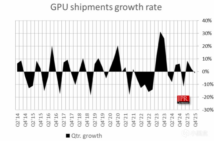 JPR 報告裏的數據挺扎心,現在 GPU 季度出貨量比過去十年平均水平低了 4.7%,廠商都在悄悄放慢生產節奏,今年整體出貨量已經同比降了 3.3%,筆記本顯卡那邊更難受。
