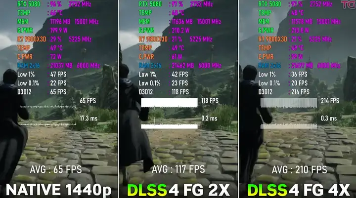 相比4070S,本身性能略強一些,且支持新特性DLSS4和多幀生成,在一些新遊戲裏可獲得更高幀數: