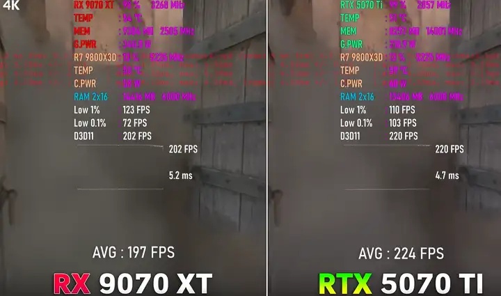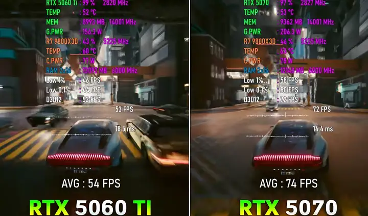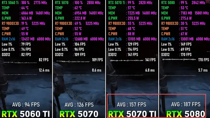 那5070TI 16G是高端的選擇,其性能前面有說到,和9070XT互有勝負: