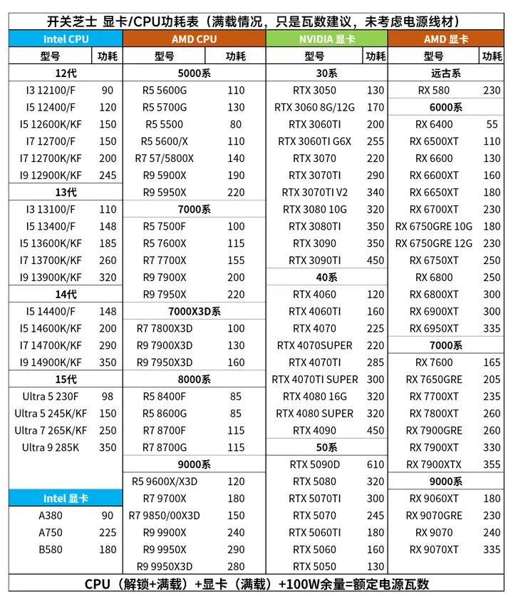 買顯卡,不知電源咋選?可參考咱的電源功率參考表: