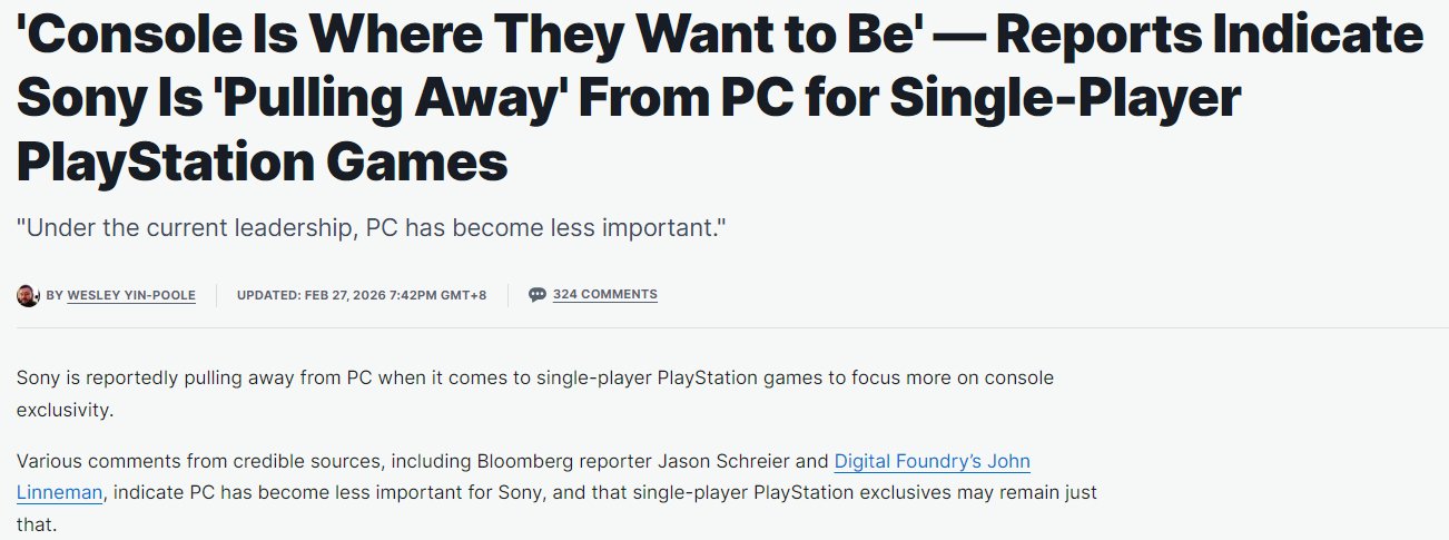 包括彭博社記者傑森·施賴爾(Jason Schreier)和數毛社(Digital Foundry)的約翰·林內曼(John Linneman)在內的多位可靠消息人士均表示,PC對索尼的重要性正在下降,而PlayStation平臺的單人獨佔遊戲未來或許會繼續保持獨佔。