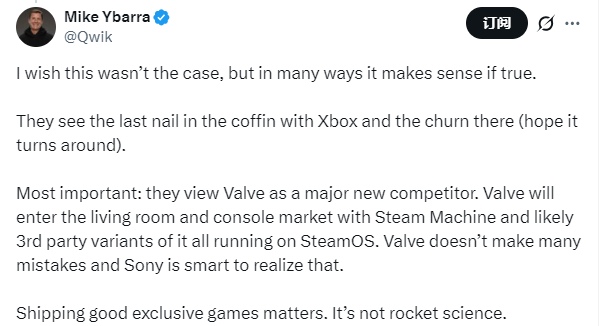 Ybarra指出,Valve即將推出的Steam主機,可能會以更具競爭力的價格、免費的聯機服務,以及橫跨微軟、索尼等各大平臺的豐富遊戲陣容,對傳統客廳娛樂市場構成衝擊。更重要的是,玩家還能自由選擇手柄,這對索尼來說,威脅比Xbox更大。