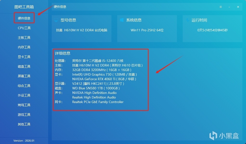 ②打开工具箱后,先找「硬件信息」这一栏,点开就能看到电脑所有硬件的详细参数。