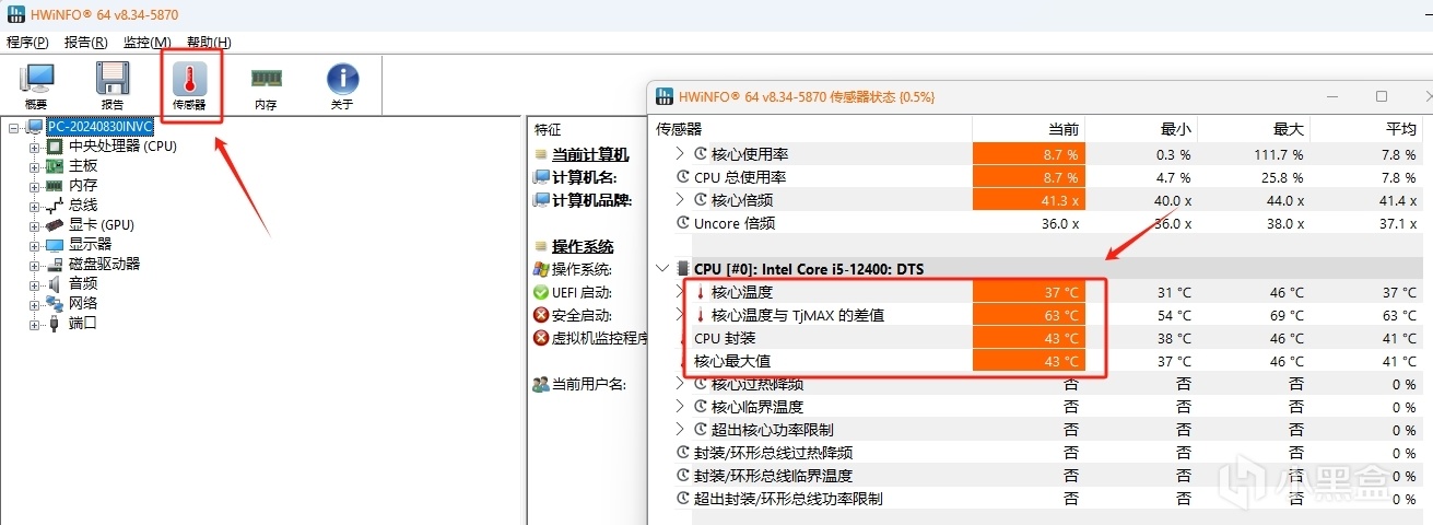 ③烤机过程中,打开「HWINFO」