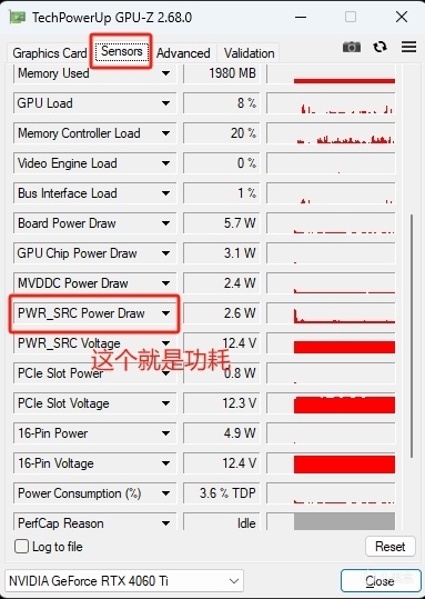 ③烤鸡过程中打开GPU-Z中的 Sensors ,查看GPU温度和功耗,这个也要符合对应显卡的官方标准。