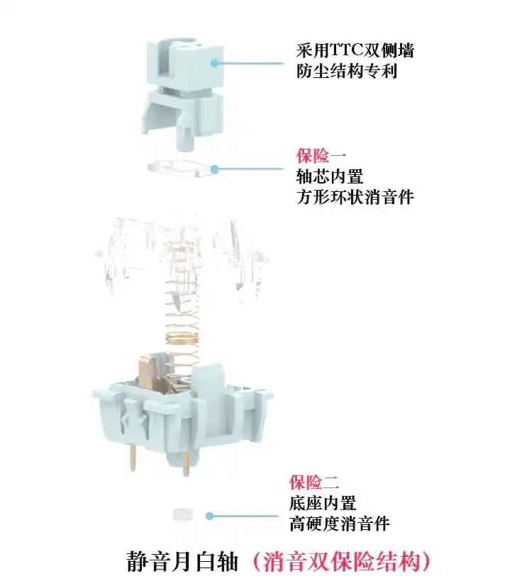 TTC金粉轴触发压力37g,触底压力约45g,触发行程2mm,总行程4mm。其核心技术是采用了22mm镀银长弹簧,这是业内首款采用长弹簧结构的轻压力轴体。长弹簧的优势在于初始压力轻、回弹行程长,给人"跟手"的感觉。轴心采用双侧墙防尘壁设计,稳定性更好,材质为改性POM。金粉轴还采用了"穿金戴银"工艺——弹片触点镀金、端子镀银,抗氧化能力提升,理论寿命高达1亿次。声音表现上,金粉轴的触发声音更脆、响度更大。
