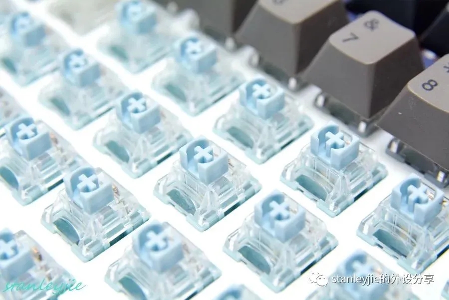 段落轴的特点是按到一半时会触发一个段落变化,会有明显的确认感。这种段落感来源于轴心上的特殊结构——凸起的小脚或滑块,在按压过程中会产生一个压力突变点。青轴、茶轴、凯华Box白轴、TTC静音月白轴都属于这一类。