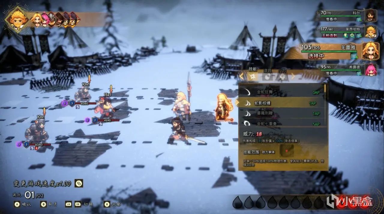 来到玩法,这一部分的体验我个人感觉一般,战棋 + 回合制已在当今市场屡见不鲜,游戏又融入了一些对站位布局的思考,放大优先级行动的策略性。比如必须优先将前排击败,才能攻击站位靠后的角色,除非有 AOE 技能与道具才能全图打击。相当于自动给前排上了嘲讽,相对应行动点靠前与血量较少的角色,可利用这层优势对敌人打出高爆伤害,并保证自己的生存空间。