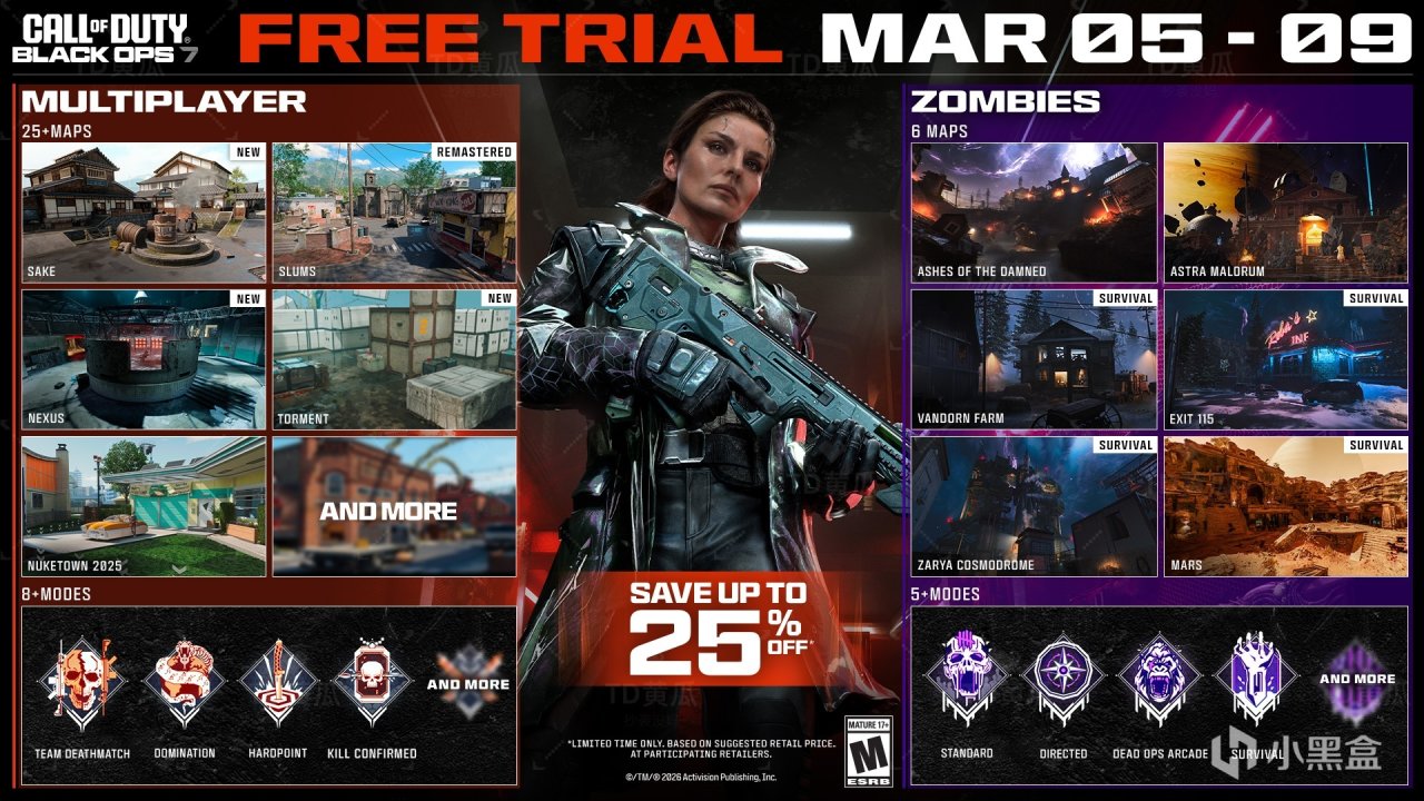 《使命召唤:黑色行动7》免费试玩现已开启,持续4天至3月10日凌晨2:00,可游玩多人模式和僵尸模式,包括超过25张多人地图、超过8个多人模式、2张僵尸回合制地图和4张僵尸生存地图,玩家还能趁此机会解锁武器、迷彩、名片挑战、或是完成僵尸模式剧情。
