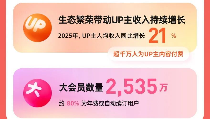 优质的机构生成视频内容,尤其是国创动画,有效带动了用户的大会员订阅。截至2025年底,大会员人数达到2535万,同比增长12%,其中近80%为年费或自动续费订阅,显示出用户较高且稳定的忠诚度。