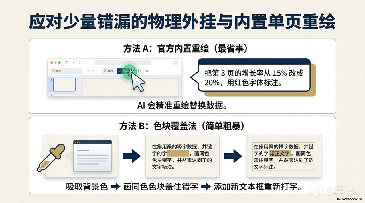 官方内置的单页修改功能(最省事):在 NotebookLM 网页端选中不满意的页面,点击“修改”,直接用中文下达指令(例如“把第3页的增长率从15%改成20%,用红色字体标注”),它就会精准重绘。