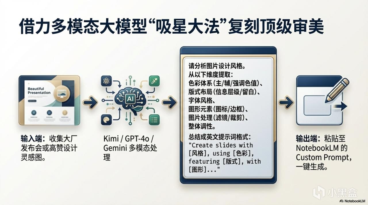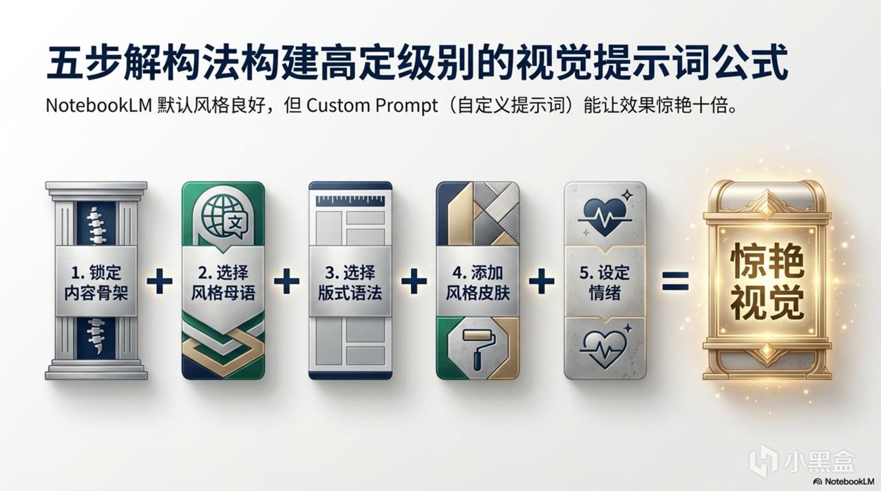 NotebookLM 生成的 PPT 默认风格虽然不错,但加上自定义提示词(Custom Prompt)效果会更惊艳。你可以参考“5步风格解构法”来构思提示词:锁定内容骨架 → 选择风格母语 → 选择版式语法 → 添加风格皮肤 → 设定情绪。