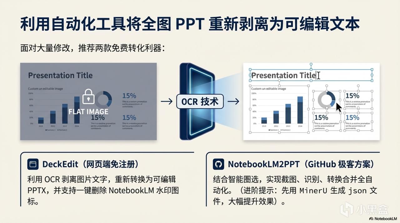 去 deckedit网站,上传你下载的 PPTX。它会利用 OCR 技术把图片里的文字剥离出来,重新转换为真正可编辑文本的 PPTX 格式,并且可以一键删除 NotebookLM 的水印图标。