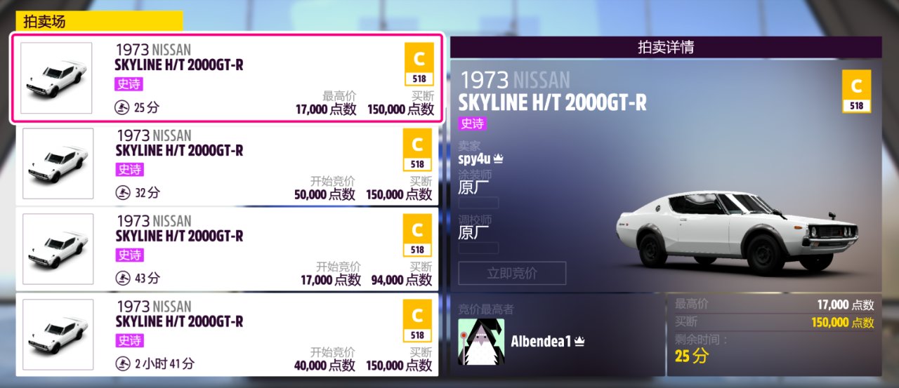 奖励车辆为:1973款NISSAN SKYLINE H/T 2000GT-R