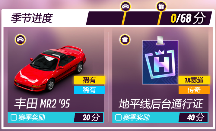 秋季赛20分进度奖励为1995款丰田 MR2 GT和40分进度奖励为地平线后台通行证