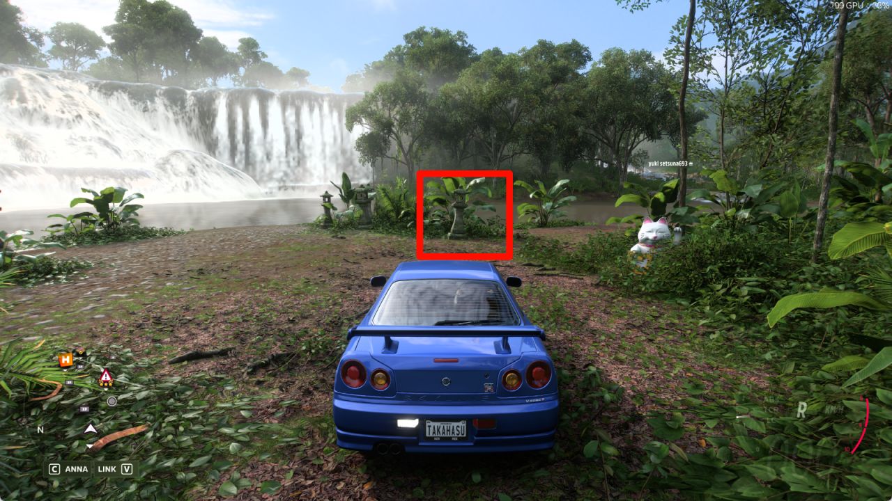 在蓝水瀑布的石灯笼旁拍摄任意日产或英菲尼迪的照片,位置如图,完成奖励为“真漂亮!!”极限竞速LINK奖励