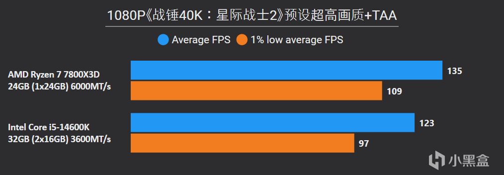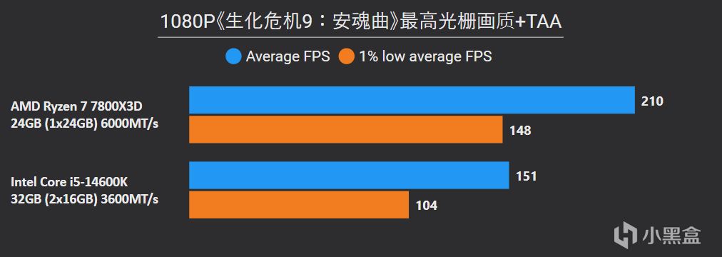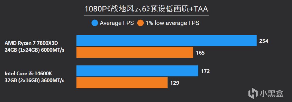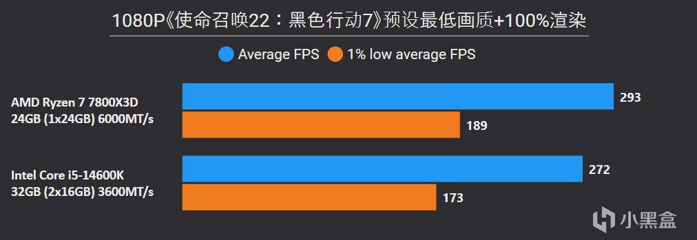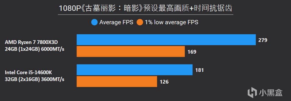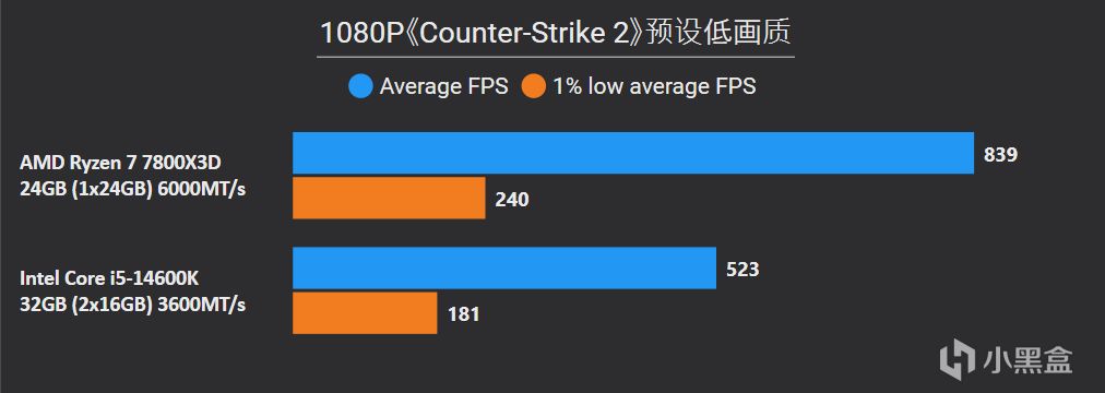從以上游戲測試結果不難看出,7800X3D即便是搭配單通道DDR5,照樣是輕鬆拿捏搭配雙通道DDR4的14600K,9款遊戲7800X3D平均幀領先幅度高達36%,1% LOW幀也有25%的明顯優勢,其中《騎馬與砍殺2》、《古墓麗影:暗影》、《Counter-Strike 2》這些項目領先幅度高達50%以上。