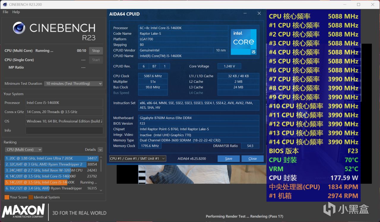 ↑14600K運行CINBENCH R23多核循環十分鐘,CPU封裝最高溫度70℃,CPU封裝功耗177W