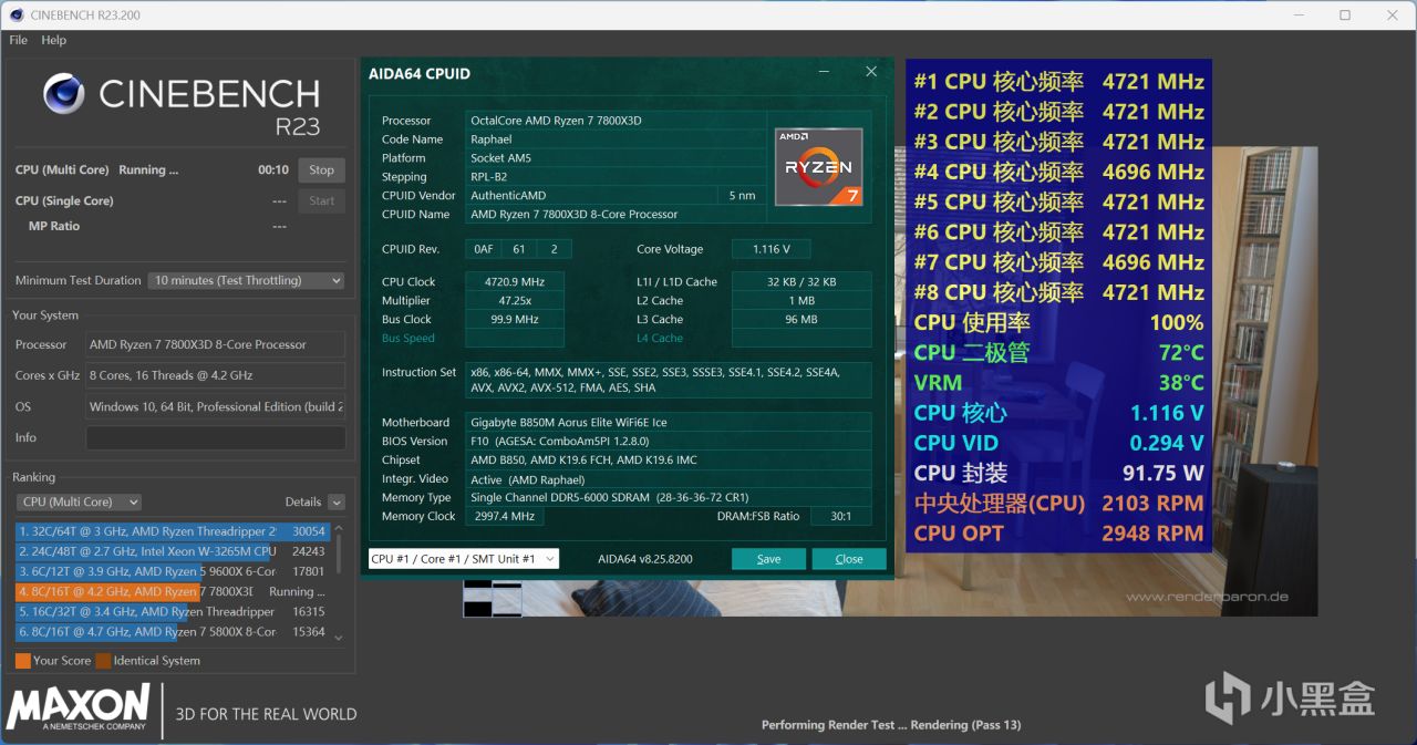 ↑銳龍7 7800X3D運行CINBENCH R23多核循環十分鐘,CPU二極管最高溫度72℃,CPU封裝功耗91W