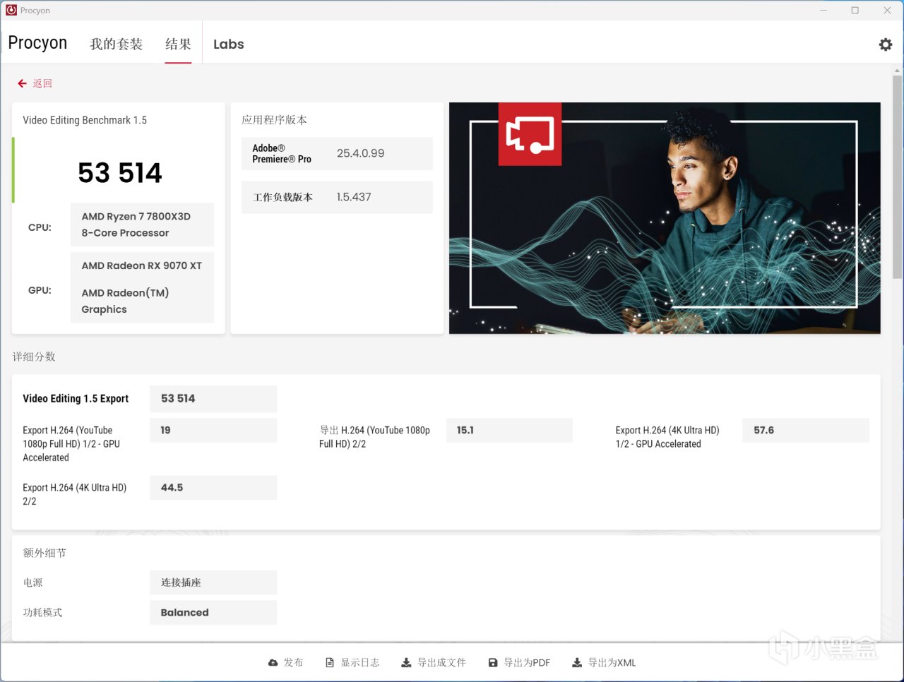 ↑銳龍7 7800X3D+DDR5 6000C28 24GB*1,Procyon Video Editing基準測試分數爲53514