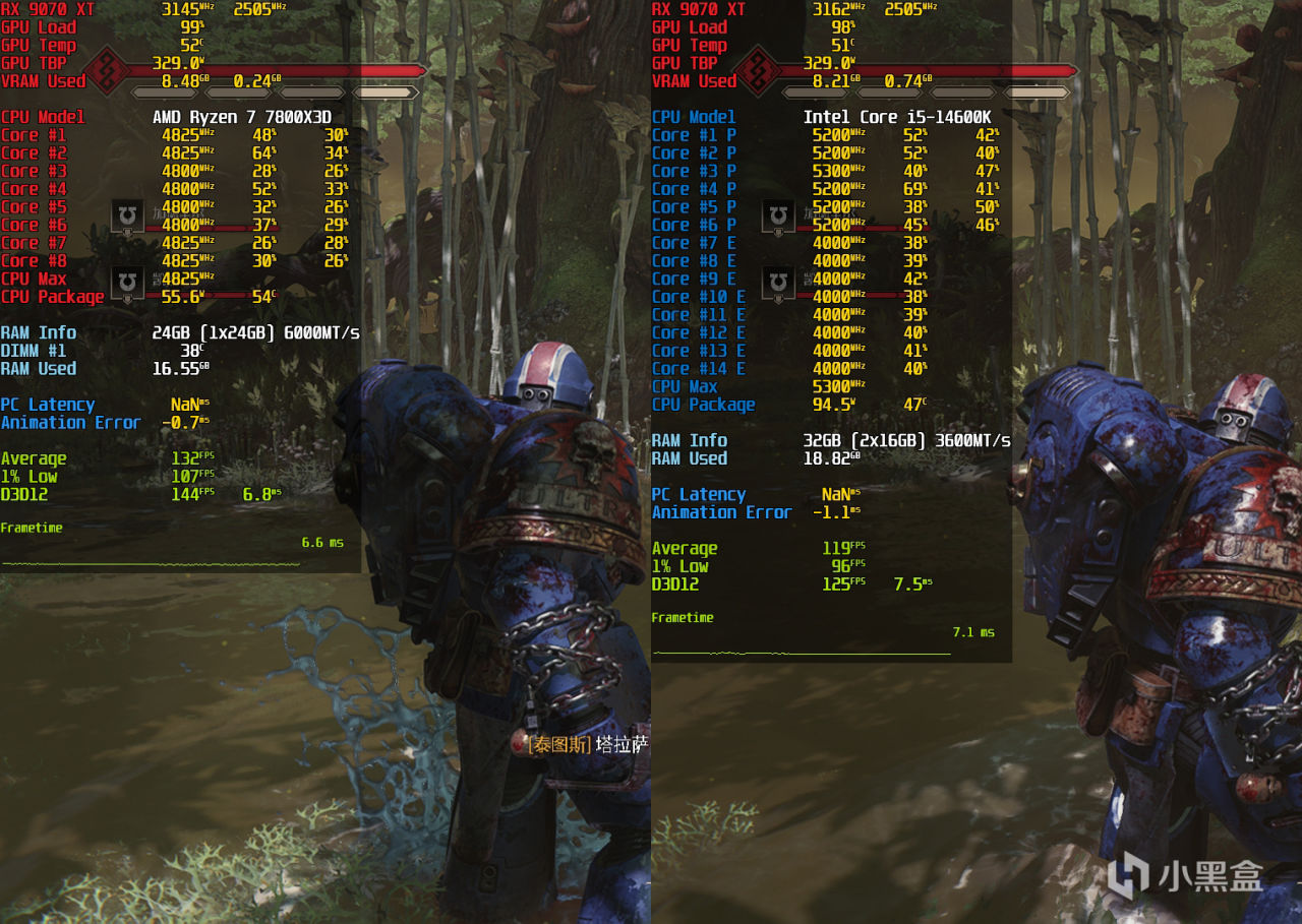 最後是散熱功耗測試,兩套平臺也有巨大差異,同樣是360 AIO水冷壓制情況下,7800X3D功耗遠比14600K要低,溫度表現則是差不多。這就很好驗證了不可忽略的論點——14600K搭配散熱器成本也比7800X3D要高,7800X3D只需要風冷方案,而14600K至少配備240水冷。