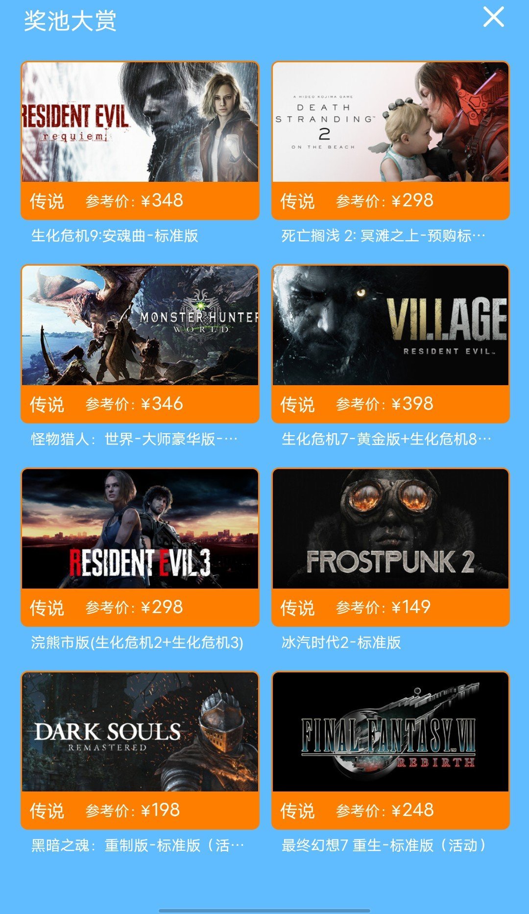 传说奖品的概率为1%,史诗奖品的概率为9%,稀有奖品的概率为90%;