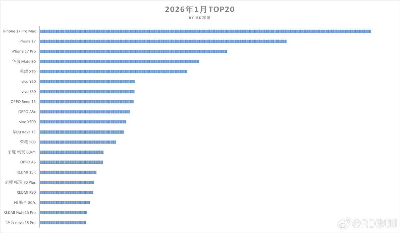 2026年1月份国内手机销量TOP20出炉,根据第三方博主“RD观测”提供的数据,苹果iPhone17系列霸榜前三,华为Mate80排名第四,荣耀X70排名第五。