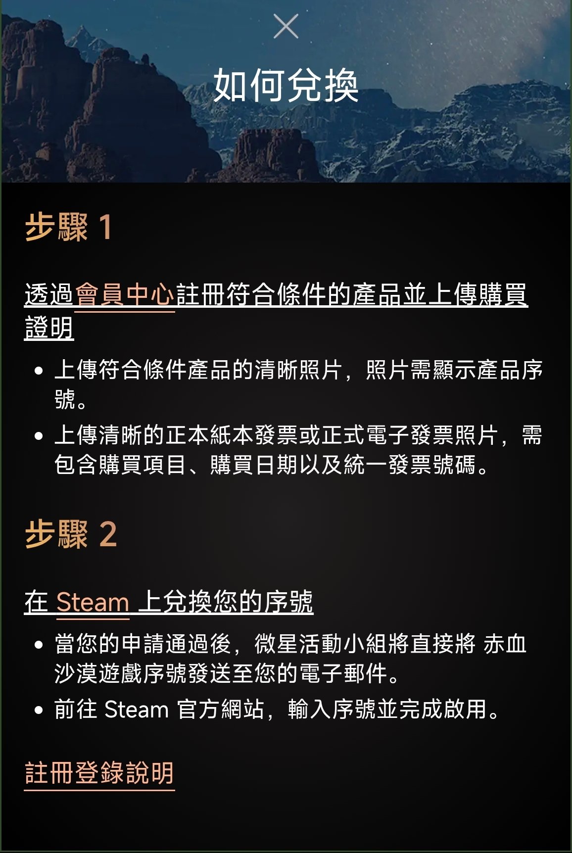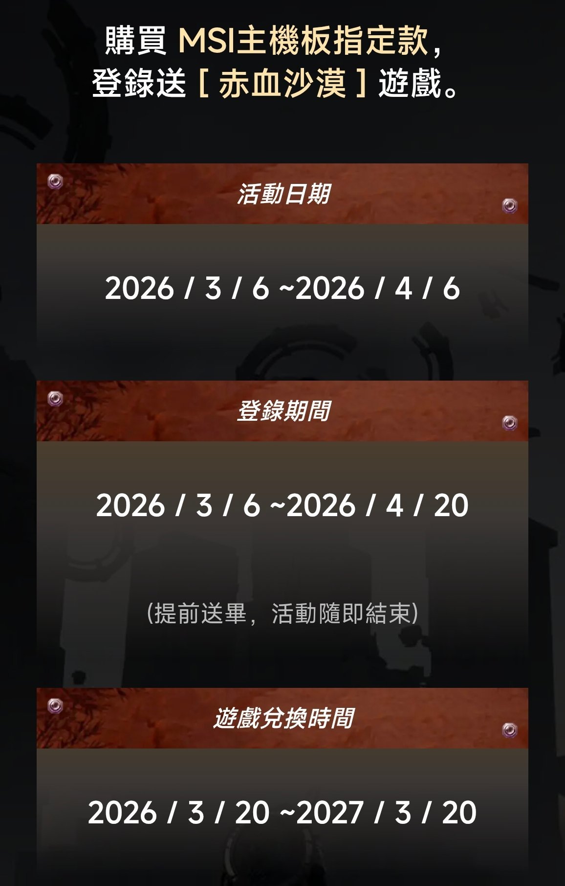 早在二月國外經銷就有買AMD套裝送紅色沙漠的活動,剛好今天在看硬件新聞的時候看見微星國際發買主板送紅沙的活動,遂進去瞥了一眼,發現港澳臺也能參加