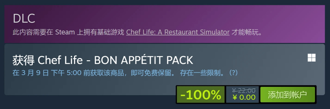 Steam免费领取【主厨人生:餐厅模拟器】DLC【祝好胃口礼包】;