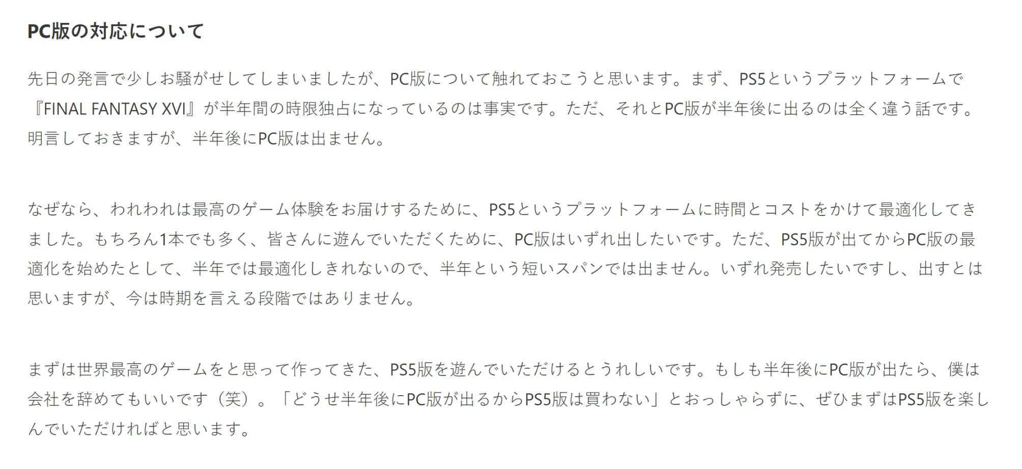 在最新一期的PS blog采访中,【最终幻想16】制作人吉田直树表示,虽然PS独占期为6个月,但游戏不一定会在独占期结束后立即登陆PC,因为制作团队在游戏发售后的首要任务是PS版本的优化而不是PC版移植的制作。制作团队不一定能够在游戏发售后6个月内同时完成这两项任务,因此PC版的玩家可能还需要再等上一段时间。