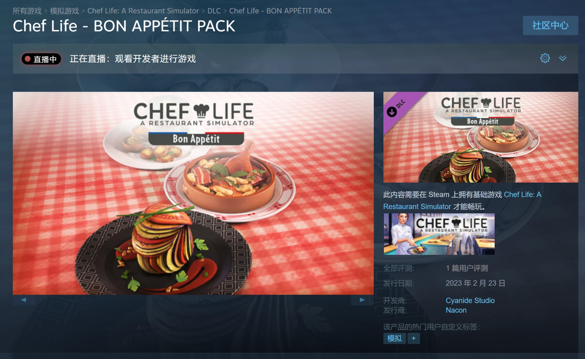 领取链接:https://store.steampowered点com/app/1788350/Chef_Life__BON_APPTIT_PACK/