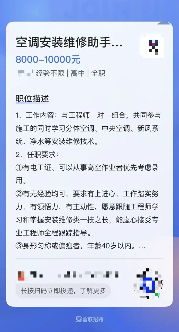 短期变现能力强,日薪 300-600 元,月薪 1w 左右,适合能吃苦不恐高的人群;空调安装旺季一单提成几百,副业增收也合适,合规持证可规避安全和法律风险
