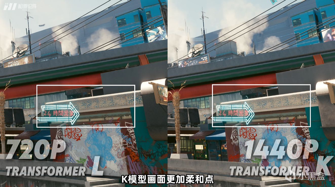 來到DLSS4的初代Transformer模型K,9P-18P就已經實現了果凍風向油畫風的畫質轉變,216P更是明顯比前代模型清晰了很多,540P基本就和1080P原生差不多了,甚至招牌上的字都更清晰些