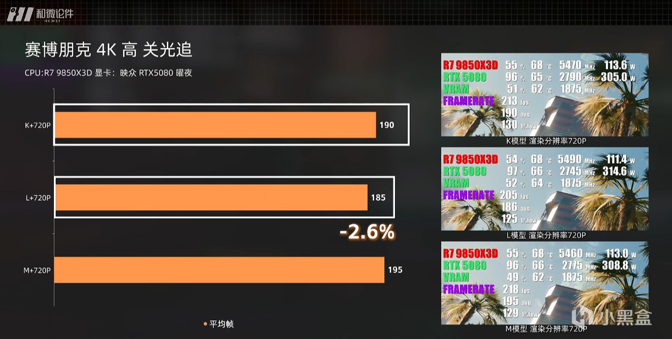 對比K模型超級性能模式平均幀低約2.6%,對比K模型質量模式(67%,約1440P)平均幀高約43.4%,除光影效果外差別也不大,K模型畫面更加柔和點,對比M模型性能模式(50% 1080P),平均幀高約23.3%。