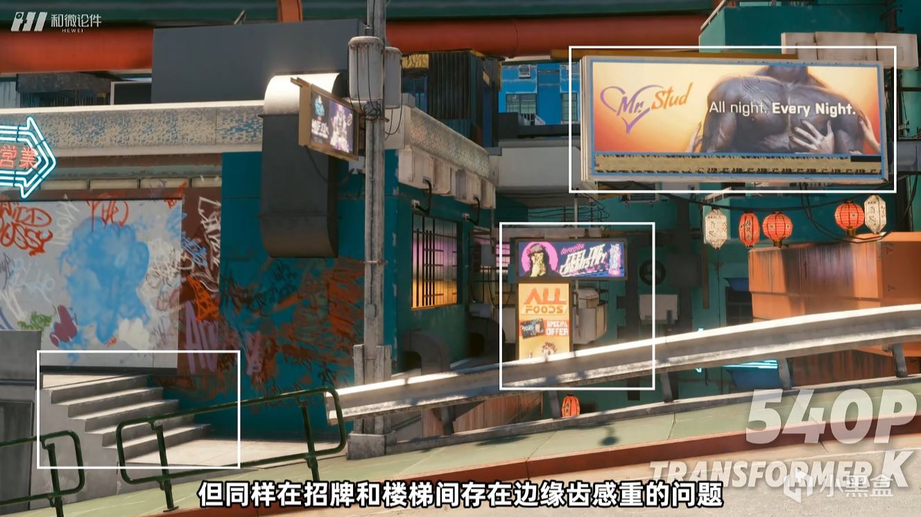 但同樣在招牌和樓梯間存在邊緣齒感重的問題,而後提升分辨率整體觀感變化也不大。