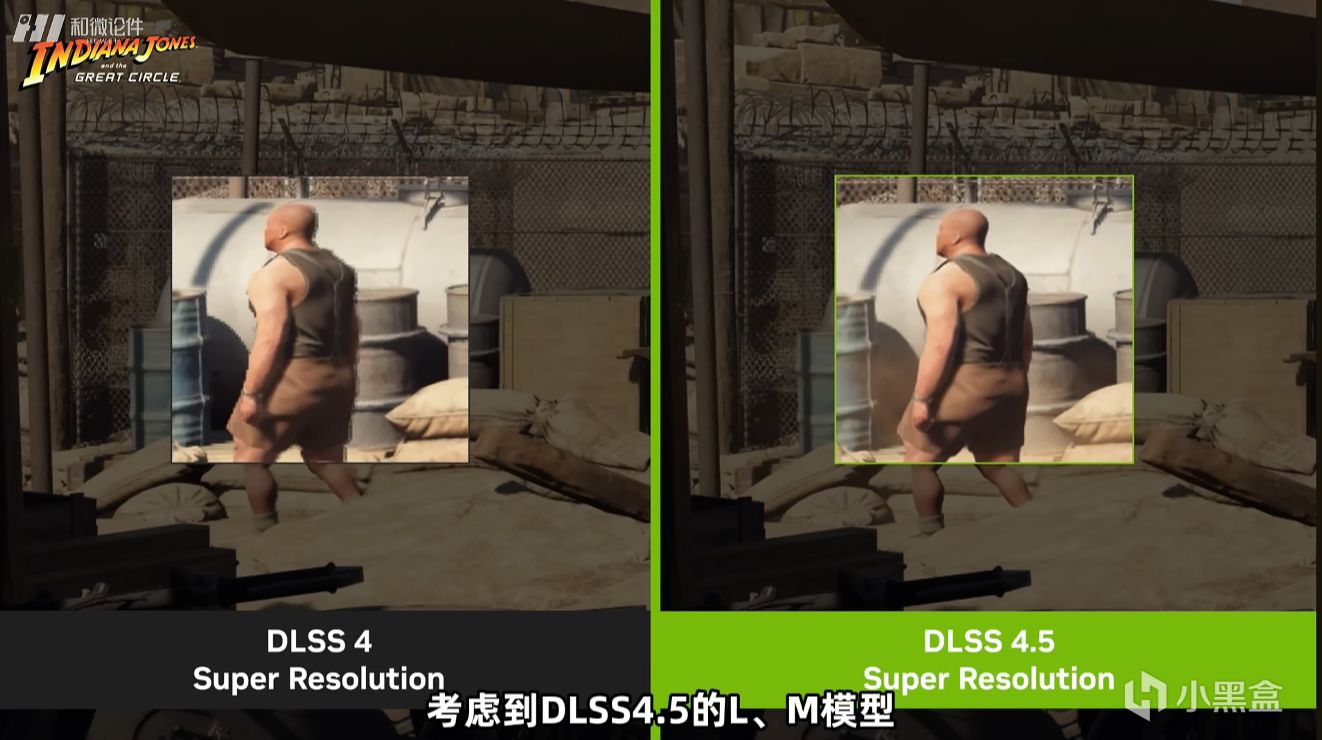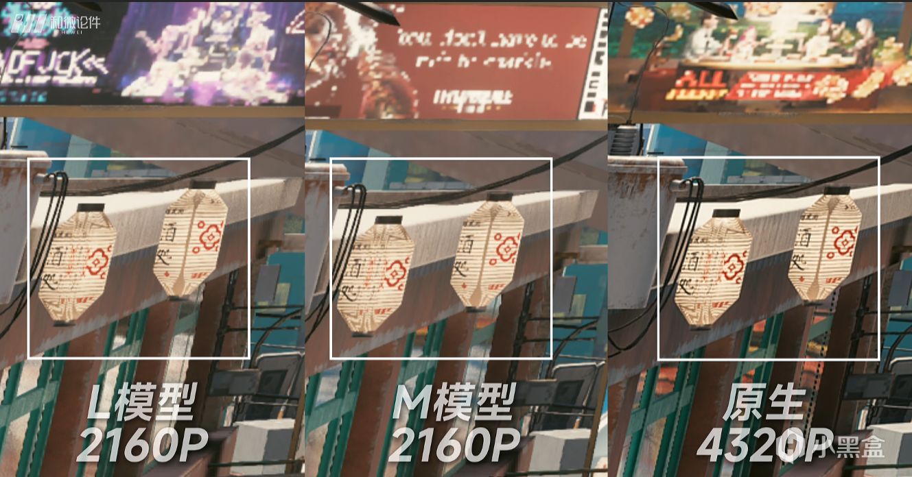 按NV官網說法,L模型搭配超級性能模式超分辨率效果最好,我們都知道DLSS一般有四個模式:質量、均衡、性能和超級性能,渲染比例分別爲67%、58%、50%和33%,你把遊戲畫面設置爲4K分辨率並且開啓超級性能模式時,基礎分辨率就是2160P像素點的33%,差不多就是720P。