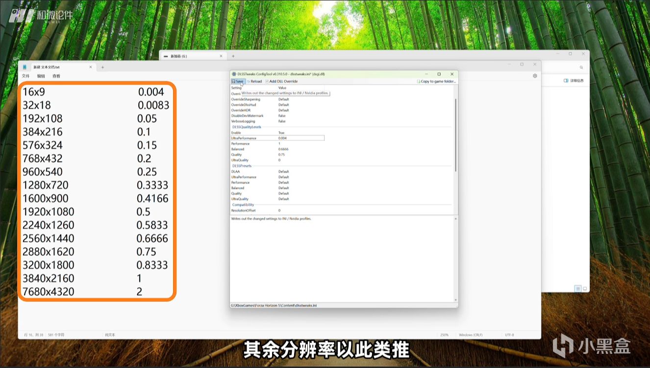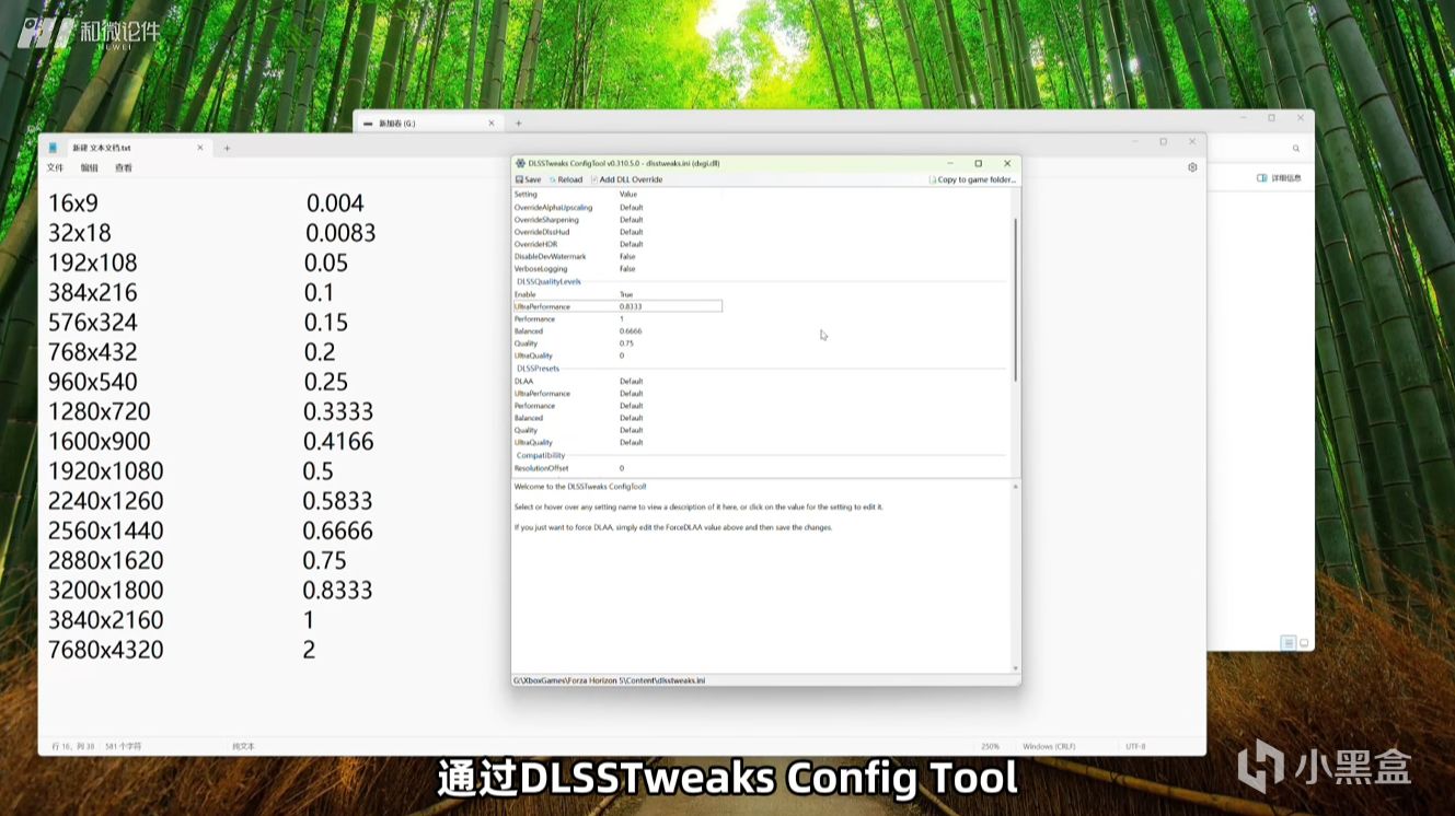 通過DLSSTweaks Config Tool,可以更改DLSS各模式的具體渲染比例,以9P爲例示範,超級性能模式(UltraPerformence)比例設置爲0.004,遊戲目標分辨率設置爲3840x2160,再打開超級性能模式,此時渲染分辨率即爲16X9,也就是9P