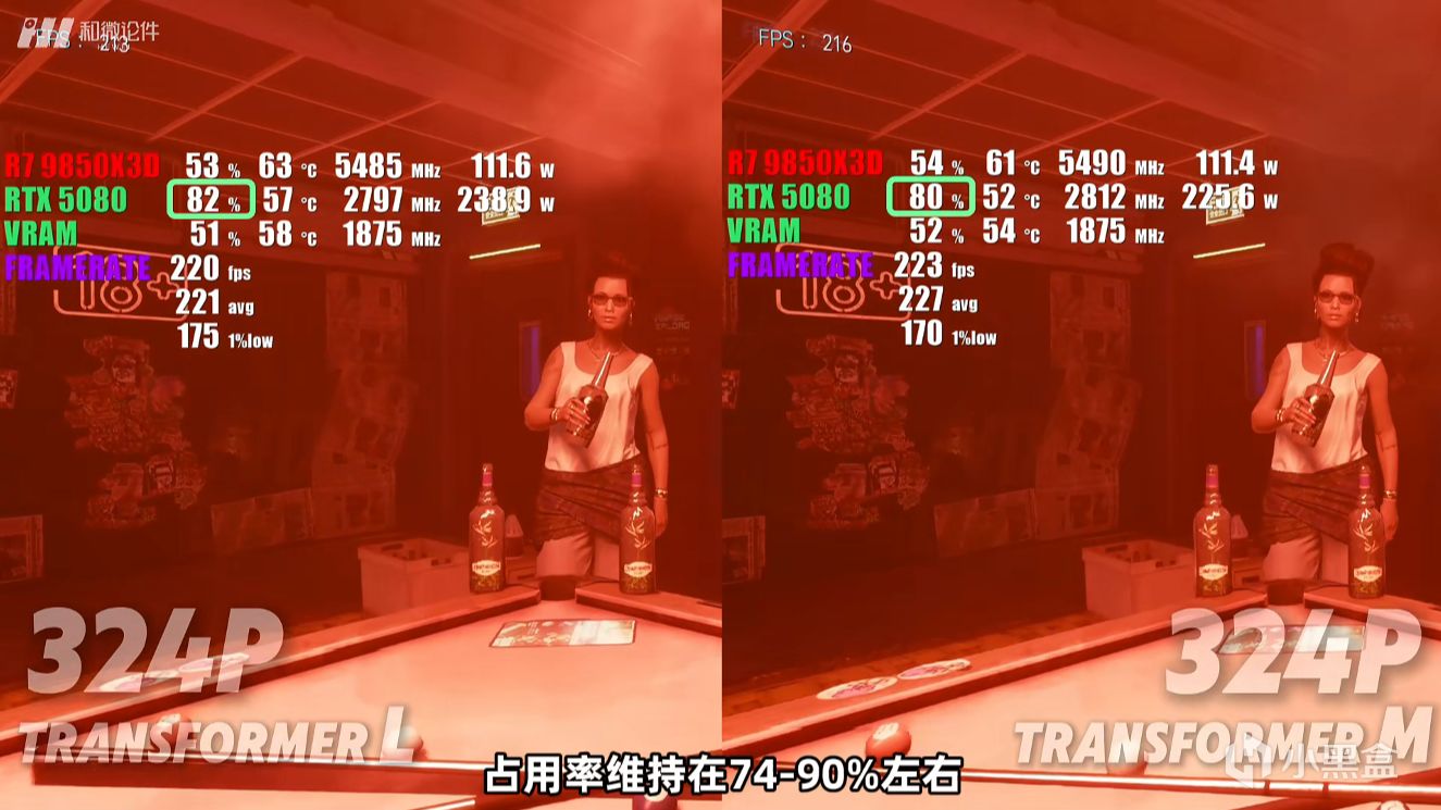 L、M模型在324P下渲染時幾乎與1080P畫質相同,佔用率維持在74-90%左右,整體佔用略低7%左右,由此可見低分辨率下,二代Transformer模型性價比最高,不僅畫質表現更好,硬件佔用還更低。