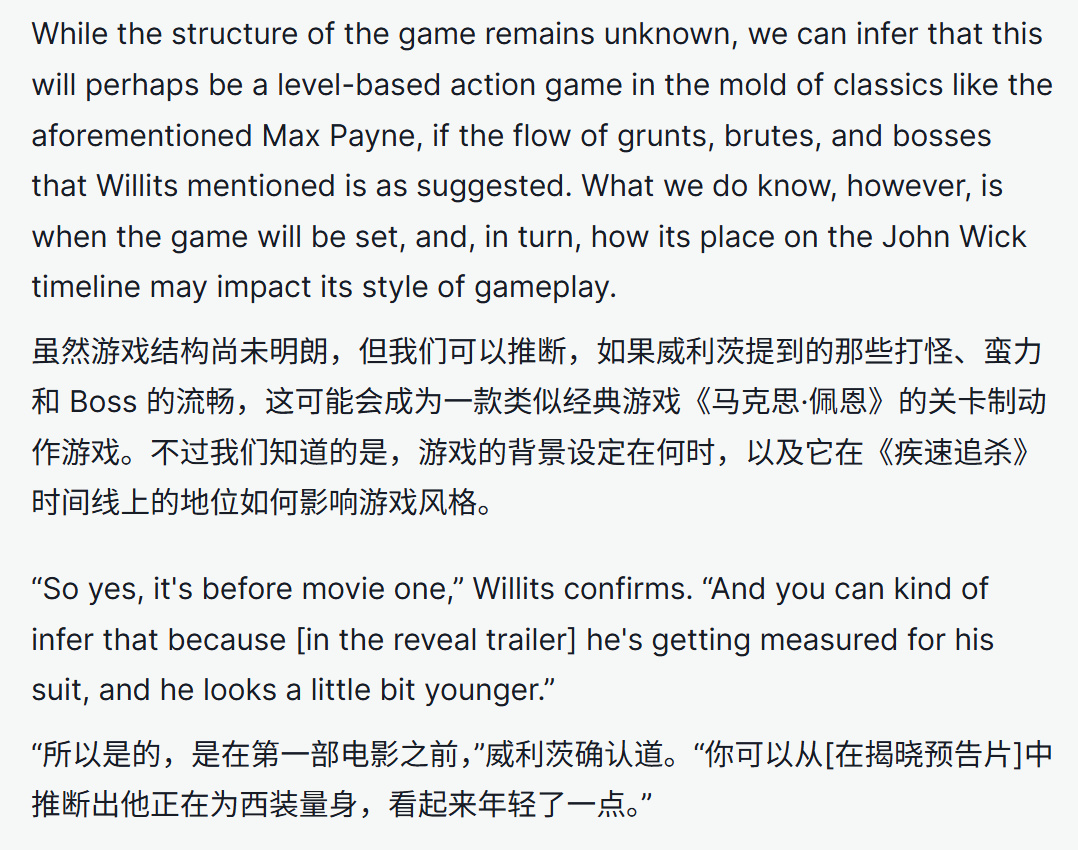 威利茨还确认游戏将聚焦于第一部电影开场前威克的人生经历。这意味着玩家将操控更年轻版本的角色,剧情很可能发生在其妻子逝世之前——该事件正位于首部《疾速追杀》电影的开端。