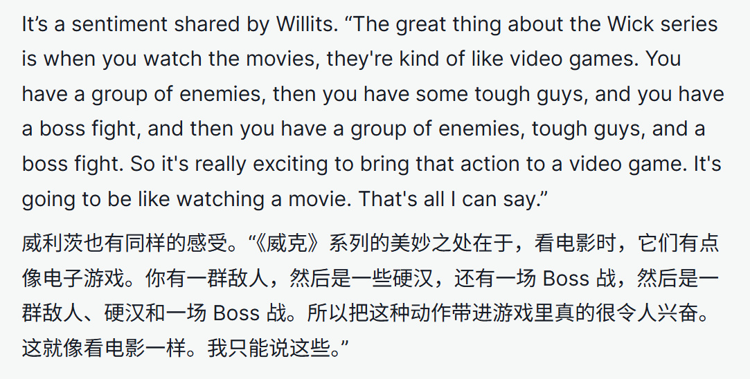 "《疾速追杀》系列电影的妙处在于,当你观看时,它们仿佛就是电子游戏,"他说道,"你会看到主角应对一群敌人,接着遭遇几个强手,然后迎来首领战,之后又是敌群、强敌和首领战的循环。因此将这种动作体验融入游戏令人振奋。游玩过程将如同观看电影,这是目前我能透露的全部信息。"